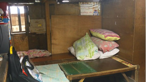 Justine and his parents all sleep on this small wooden bed tucked into the corner of their home.