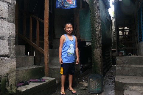 This is Justine. The 8-year-old from Manila lives in a two-room home with his parents and older brother.